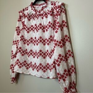 English Factory Ruffle Floral Eyelet Blouse Top White Red