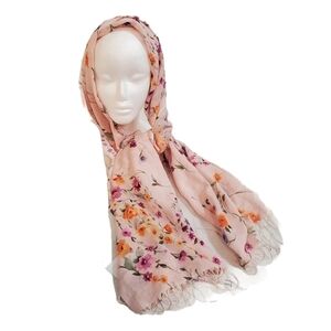 English Home pastel pink lightweight long scarf with pattern of Spring flowers in purples, yellows, and pink, and with fringed ends. Can be used as a head scarf or neck scarf. New with tags, no flaws.