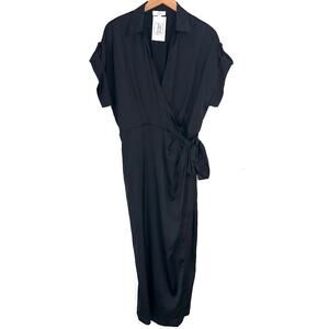 NWT Entro Black Satin Short Sleeve Collared Wrap Midi Dress Size Large