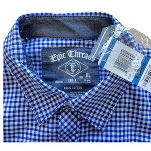 This Epic Threads boys' size XL button down plaid shirt is brand new with tags. It was purchased from Macy's and retails for $25. The shirt is 100% cotton and features a blue and white plaid pattern with two chest pockets. It has been stored in a smoke-free environment.