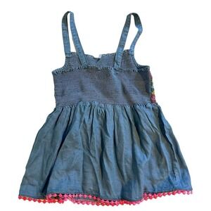 Blue denim top with rainbow smocked detail and pink pom-poms at the hem, Square neck, Sleeveless, 100% Lyocell.