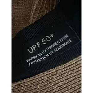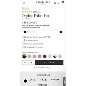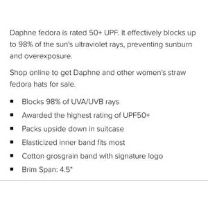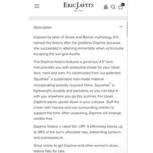 This is a new Eric Javits Daphne Fedora Hat in natural/black, priced at $385.00. The hat features a woven straw-like material in a natural tan color with a black grosgrain ribbon band. It has a wide, slightly upturned brim measuring 4.5 inches and is designed for sun protection with a UPF 50+ rating, blocking 98% of UVA/UVB rays. The hat is one-size-fits-most with an elasticized inner band and is packable. It is labeled "Made in China."