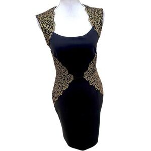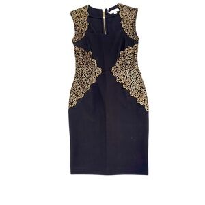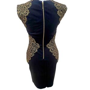 New with tags Erin black Ponte knit bodycon fitted dress with gold rosette embroidery. Back gold tone zipper. Cap sleeve. Scoop neckline. New!
