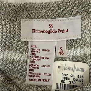 Ermenegildo Zegna crew neck sweater. Lightweight enough for summer. Neutral tan and white pattern. Size Small/48 slightly oversized. Chest measurement was photographed. New with tag from Neiman Marcus attached. Happy to answer questions