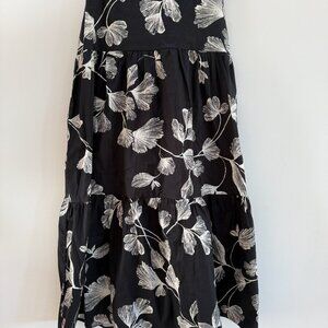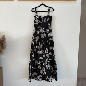 Brand new with tags. Dress by Especia in size small. The Mandevilla maxi dress, with its fitted top design, enhances the figure with a delicate V detail at the neckline. Meanwhile, the flowy skirt adds movement and freshness with every step. Featuring an exclusive Especia print in a sophisticated Black shade, this design is perfect for special occasions or whenever you want to stand out with style.
