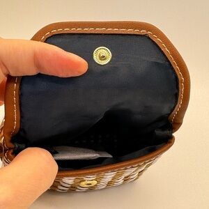 You can put small cosmetic like lipstick or lip balm or you can use it as a coin purse. It’s a lightweight beautifully woven piece