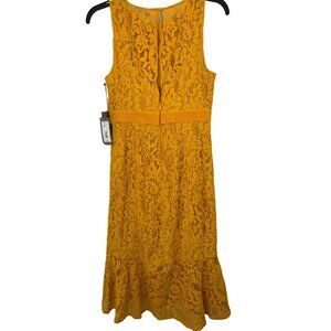 NWT Eva Mendes NY & Co 8 Mustard Lace Overlay Midi SL Dress Ruffle Hem 6828