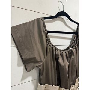 This brand-new Eva Mendes scoop neck midi dress from New York & Company, in large size, boasts a chic brown and tan shade. Made with cotton and spandex, it features a zip in the back, pockets, and a front-tie belt.