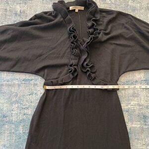 Long sleeve sweater dress with banded dolman sleeves. Ruffles go around the neckline and loop around the back creating a jacket like effect.