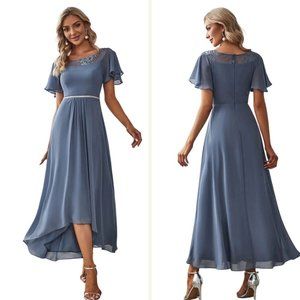 NWT Ever Pretty Hi Lo Chiffon Dress sz L Illusion Lace Top Rhinestone Waist Blue