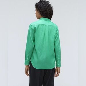 NWT Everlane The Silky Cotton Relaxed Shirt in Mint Green & White Pinstripes, Size 0. Drapey button-down shirt with long sleeves and 2-button closure, pointed collar, and back pleat.