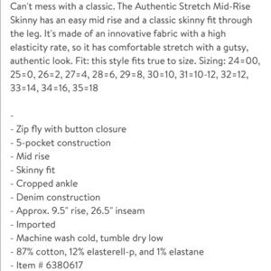 New with Tags! (& still in plastic wrapping from retailer). Everlane The Authentic Stretch Mid Rise Skinny Crop Jeans. Size 23. (Please see photos for sizing chart, material content and additional information).