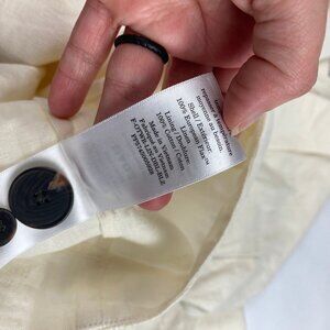 Ivory blazer features a relaxed fit, double breasted button design, half lined, button closure, and front welt pockets. 100% linen shell.