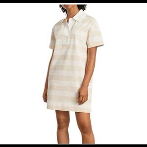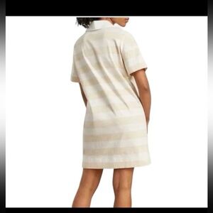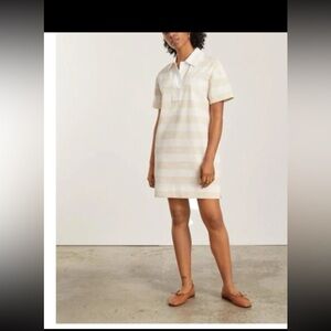 Everlane The Organic Cotton Polo Dress Beech Bone Tan White Stripe Size Medium; A polo that's a dress? Yes please. The Organic Cotton Polo Dress features a relaxed point collar an open plunge neckline blouson sleeves side slits an above-the-knee length and an easy relaxed fit. Plus it's made of 100% organic cotton for softness and breathability.