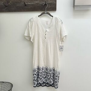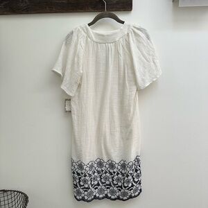 Maternity/Nursing Dress Size XS and Matching Baby Dress size 12 months. Rock your best casual chic vibe in this embroidery-trimmed tunic dress with scalloped hem and flouncy sleeves. Unbutton the front neckline to reveal a buttery soft knit jersey slip with easy pull aside nursing access. Subtle gathers at the front placket ensure a flattering fit during and after pregnancy. Mom can match with baby in our Eyelet Two-Piece Dress size 12 months.