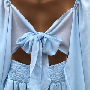 NWT Exlura Baby Blue Mini Dress Lantern Sleeves Tie Back Ruched Waist Size M