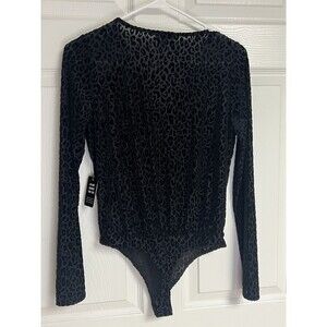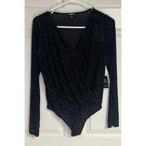 NWT Express Black Leopard V Neck Velvet Bodysuit MSRP $59 Sheer Sleeve