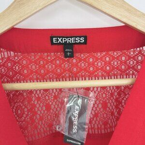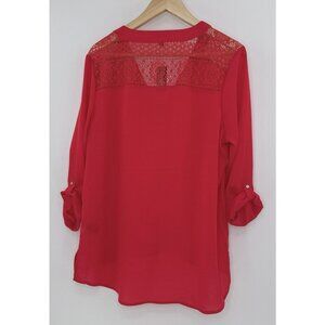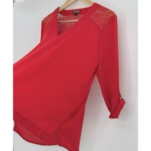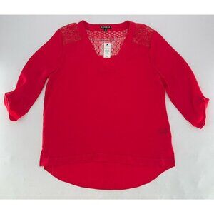NWT Express Cherry Red Chiffon Roll Tab Slv Hi-Low Blouse L Lace Back Preppy