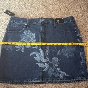 A dark wash denim mini skirt with a cool floral design is the perfect addition to your closet for this season. This style features hand and back pockets, belt loops, and a high rise waist.