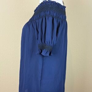 NWT Express Navy Blue Off Shoulder Peasant Blouse with Smocked Collar and Arm Cuffs; Size Extra Small; When lying flat, measures 18” pit to pit and 21” in length; Fabric and Care instructions shown in pictures.