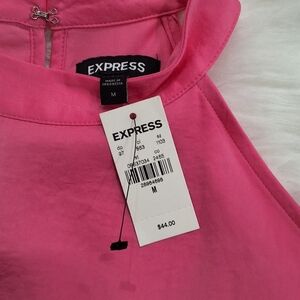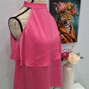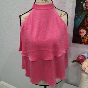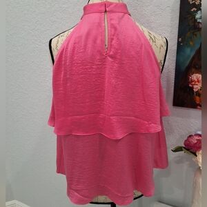 Pretty pink (rose) halter top with a layered design. Satin finish, lightweight, and flowy. Super fun and flirty.