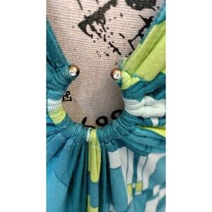 Beautiful shades of Blue/Green w/Yellow & White in a Geometric Print. Very soft, flowing material. Perfect for warm weather! Material at Bustline is gathered & held in place w/a Brushed Gold Ring w/Rhinestone accents. Very Pretty. Lightweight.