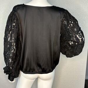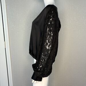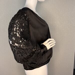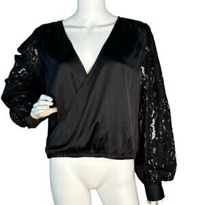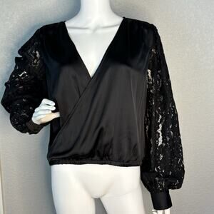 NWT Express Top Blouse Faux Wrap Surplice V Satin Lace Sleeve Black Size L