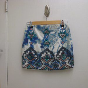 NWT Express sequin mini skirt size XS extra small. Awesome tribal aztec geometric sequin design on front and back, with tie-dye fabric underneath. The main colors are white, blue and green. Fully lined. Elastic waistband for pull-on styling. Brand new, never worn. Original price: $59.90