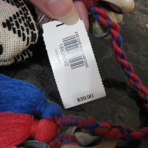 NWT Express black white red pink blue yellow gold silver makeup make up cosmetic travel beach bag pouch. Has a black and white print pattern on fabric with coins, beads and shells, and attached braided tassel. Zip closure. Made in India. Brand new, never used.