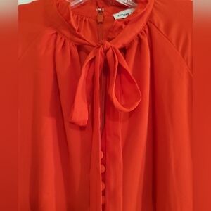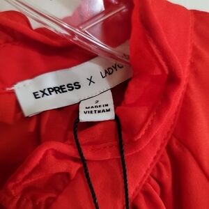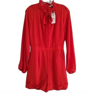 NWT Express x Ladygang Red Tie Ruffle Neck Long Sleeve Shorts Romper. Ruffle Neck. Tie at neck. Elastic cuff Long sleeves. Victorian look. Cuffed shorts.