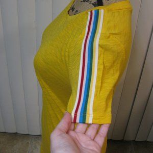 NWT Express One Eleven yellow tee top shirt size XS extra small. Striped rainbow ribbon design on both sleeves. The fabric is a very soft and somewhat sheer burnout or slub. Brand new, never worn. Original price: $24.90
