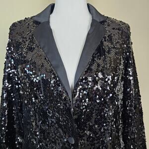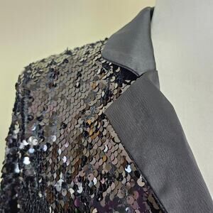 Step out and make a statement in this spectacular, New With Tags (NWT) Extro&vert sequin blazer. The jacket is fully covered in shimmering black sequins that catch the light beautifully, making it the perfect glam centerpiece for any event. Featuring a classic, tailored single-breasted silhouette and a sleek satin trim, this piece instantly elevates jeans and a tee or completes a stunning formal ensemble. Don't miss out on this ready-to-wear showstopper for your next night out!