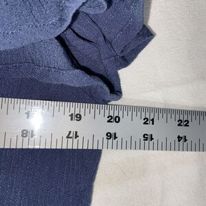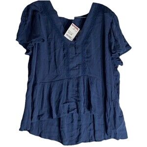 Eyeshadow" brand blouse in size XL is a casual yet feminine piece featuring a textured navy fabric, V-neckline with lace trim, fabric-covered buttons, flutter sleeves, and a flattering peplum hem. Lightweight and breezy, it's perfect for warm-weather layering or standalone wear., and is made of lightweight and breathable rayon material. The garment care instructions include machine washable.