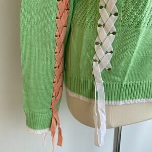 Soft knit sweater from Eyeye fitted with tied lace-up accents along the front and long sleeves. Cut in a relaxed fit with ribbed trim at the crew neck, cuffs and hem. 95% Acrylic, 5% polyester.