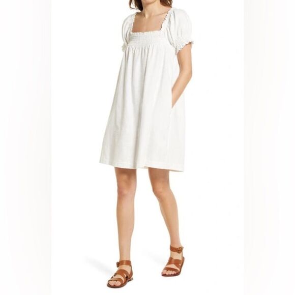 NWT FAHERTY Ramona Organic Cotton Shift Dress Egret White Puff Sleeve Top Small