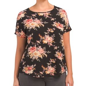 mixed media, floral print, knit back, cuffed sleeves, keyhole back with tie closure, fabric provides stretch