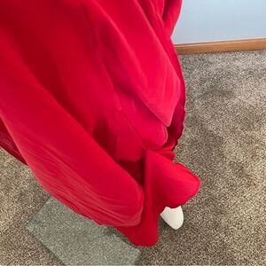 This Fame and Partners dress is brand new with tags. The back features straps that tie closed, giving it a variation to how it fits. Gorgeous red silk. Draped neckline. US size 6.