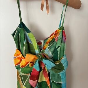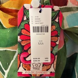 NEW WITH TAGS: This dress is part of the FARM (FarmRio for Anthropologie) Collection. Size XXS. Green Tropical print on textured fabric. Side zip with hook & eye closure. Unlined. Empire waist with ruching at back. Adjustable straps. 100% Viscose. Machine washable.