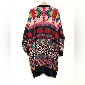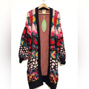 Farm Rio cardigan, Crazy Mix sweater, long knit coat, statement cardigan, colorful sweater, designer knitwear, eclectic fashion, bold layering piece, NWT Farm Rio, editorial knit, geometric print cardigan