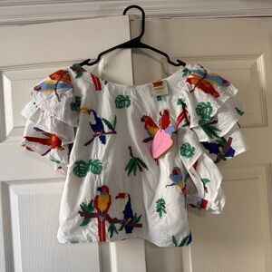 Brighten your look with this iconic parrot crop top. Features playful ruffle sleeves and crocheted parrots for a lux woven texture. Has the beautiful craftsmanship Farm Rio is known for.