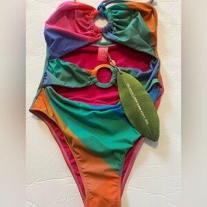 Make a splash in this vibrant, statement-making one-piece from Farm Rio! Featuring bold color-blocked plaid in sunset hues and playful cutouts with a center ring detail, this swimsuit is equal parts flirty and fun. Adjustable halter ties and full lining ensure a secure and flattering fit.
