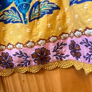 This FARM Rio skirt is a stunning maxi-length piece, featuring a vibrant blue and yellow color palette perfect for resort wear. Its a-line silhouette is enhanced by a tiered design, offering a flowy and comfortable fit ideal for casual outings. The skirt's elasticated waistband ensures ease of wear and a flattering fit.