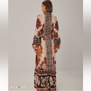 FARM Rio gown, a perfect choice for wedding guests or resort wear. This dress showcases a deep V-neckline and long bishop sleeves, crafted in a rich palette of brown and orange hues.