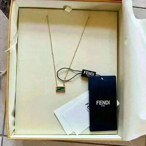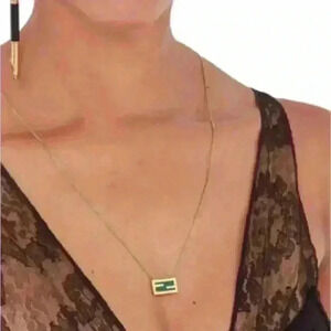 FENDI Baguette Emerald Green Stone & Gold Logo Long Necklace