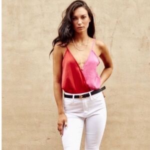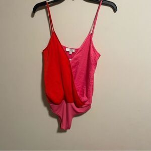 Gorgeous hot pink and red colorblock bodysuit. V neckline. Adjustable spaghetti straps. Hook closure in the front. Snap crotch. As seen on The Bachelor as well as being a blogger favorite.