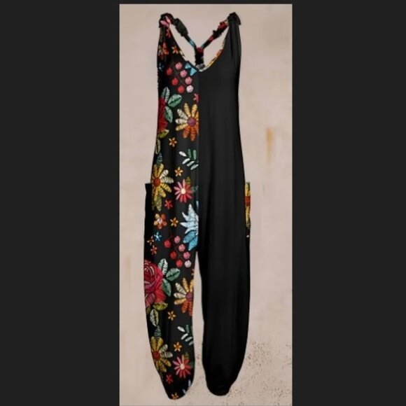 VERY SOFT, COMFY / COZY JUMPER HAS A FABULOUS ONE-SIDED FLORAL DEISGN! LIGHT WEIGHT SO PERFECT FOR THE SPRING/SUMMER MONTHS. THIS JUMPER GATHERS AT THE ANKLES AND HAS POCKETS!