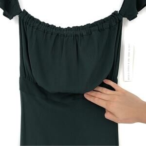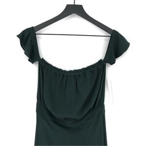 New w/Tags Flynn Skye Bella Maxi Dress in jewel emerald green. Elastic hem across the neckline, off the shoulder straps that are ruffled and hang. Wrap skirt, but doesn't really show a slit. Zipper closure down the back. Great condition!