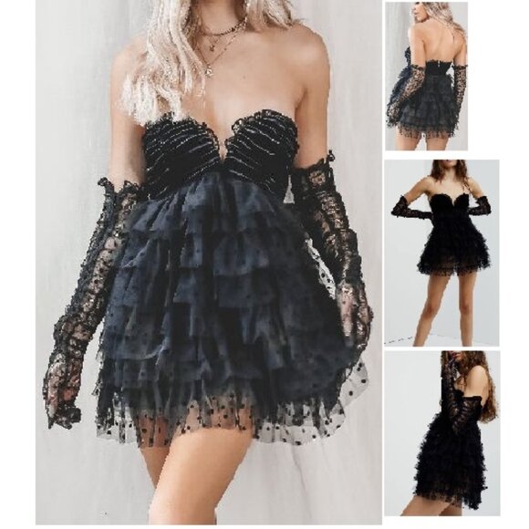 NWT FOR LOVE & LEMONS JOURDAN OFF THE SHOULDER BLACK MINI DRESS W/GLOVES SIZE S