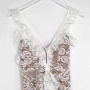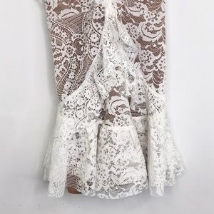 Super sexy For Love & Lemons white Tati Lace ruffle mini dress with a nude color lining and tiered ruffle detail throughout. Brand new with tags. First two photos are for modeling purposes only and do NOT reflect the item for sale.