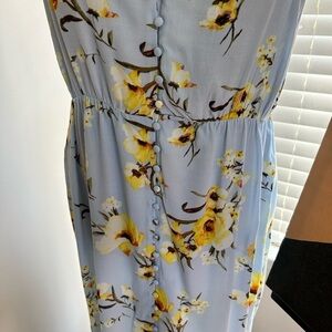 NWT FOREVER 21+ BLUE/YELLOW FLORAL MAXI DRESS SIZE 3X. ADJUSTABLE STRAPS, DELICATE BUTTON DOWN FRONT, RUFFLED BOTTOM. ****ONE BUTTON MISSING AS SEEN IN PHOTOS.